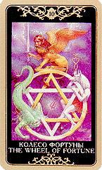 Колесо Фортуны (Удача) символизирует вечные перемены, постоянное становление и разрушение, непостоянство как счастья, так и невзгод. Карта считается символом прогресса, а он даром нс дается. Для победы необходимо осознанное желание, дерзание и бесстрашие. Карта может означать неожиданную улыбку судьбы, но надо помнить, что вращение колеса предполагает круговорот вещей и событий. Перевернутая карта: говорит о том, что жизненная позиция осознана, вы можете начать трудиться, перемены будут позже. Также может означать несообразные действия в неожиданных ситуациях, сопротивление переменам, которые все равно должны произойти. |