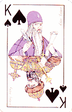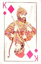 Пики: "Борис Годунов". Трефы: "Песнь о вещем Олеге". Бубны: "Сказка о царе Салтане". Червы: "Каменный гость".