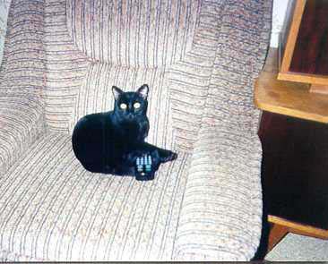 Ч╩рный кот Мерлин родился 6 июня 1997 года. Его растили для одного мужчины, у которого была овчарка. Но через день после того, как он взял кот╩нка, ему пришлось вернуть его обратно, потому что собака чуть не загрызла котика. У хозяев он жил с тремя собаками и тремя кошками. Его папаша Корвин, тоже черный, и очень боевой: в драке с котами лишился глаза. Мерлин оказался очень ловким - однажды он вытащил вареник изо рта собаки, когда она собиралась его уже прожевать! А к нам Мерлин попал, когда ему было три месяца. Но у него слишком длинное имя. И мы укоротили его до Мули.