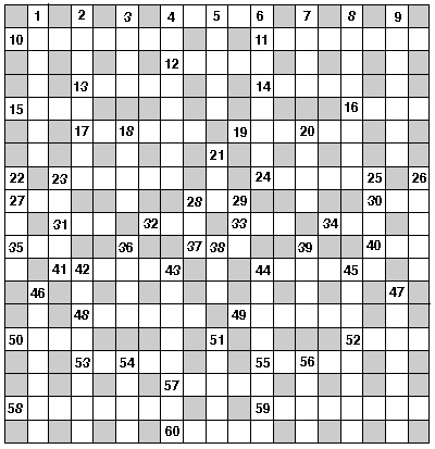 по горизонтали: 4. Мелкая разменная монета в Англии и некоторых других странах. 10. Аэропорт в Твери. 11. Живопись, выполненная оттенками одного цвета. 12. В некоторых старых армиях: высокий головной убор из жесткой кожи с козырьком. 13. Установленная мера, средняя величина чего-нибудь. 14. Окружение войсками укрепленного места с целью его захвата. 15. Часть суток. 16. Часть суток. 17. Дворянский титул в странах Западной Европы, средний между бароном и графом. 19. Дворянский титул в Западной Европе. 23. Напряжение сил. 24. Сторонник воззрений, отвергающих всю совокупность религиозных представлений. 27. Навесная палуба на судне. 28. Крестный отец по отношению к родителям крестника и к крестной матери. 30.Стержень, на котором держатся колеса, вращающиеся части механизмов. 31. Специально оборудованное помещение для стрельбы по мишеням. 32. Детская игрушка, вращающаяся на оси. 33. Коктейль - лимонный сок + спиртные напитки + газ.вода. 34. В старой Польше, Литве, Белоруссии, на Украине: помещик, барин. 35. Маяковский - стихотворение. 37. Связка, охапка. 40. Орган обоняния. 41. Верхняя опорная часть у мебели. 44. Мягкая толстая подстилка на кровать. 48. Предмет мебели в виде доски на ножках. 49. Мелкое двукрылое насекомое южных стран, причиняющее болезненные укусы. 50. Значок на игральной карте или кости. 52. Марка автомобиля - США 53. Аэропорт в Париже. 55. Небольшой зверек тропических лесов - полуобезьяна с длинным хвостом и удлиненными задними конечностями. 57. Вид украшения. 58. Стопка или большая рюмка удлиненной формы. 59. Водопад на реке Виктория, Африка. 60. Лиственное дерево, родственное тополю. Вопросы по