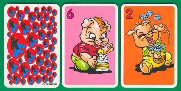 | Колода "Pinky Piggys Quartett", изданы "Ferrero", Германия, 1990-е, 37 листов размером 57х85, без коробки. |