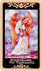 Воздержание (Время, Умеренность) символизирует обновление душевных и физических сил, умеренность, осмотрительность, соединение творческого и рассудочного. Карта означает стабилизацию в делах, успехи. Когда эта карта выпадает после плохой, то может обозначать, что в борьбе с неприятностями вас ждет победа, добивайтесь ее кропотливо и неуклонно. Перевернутая карта: неправильный подход к жизни и окружающим людям, чрезмерная вспыльчивость, непредсказуемость, неразумные поступки. |