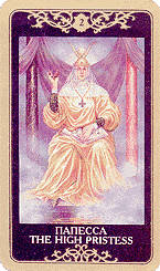 Папесса, (Верховная жрица, Знание) символизирует духовную мудрость, терпение, молчание, глубокое познание и понимание вещей видимых и невидимых; мудрость женского естества, сильная интуиция. Карта означает, что вы пытаетесь понять высший смысл чего-либо, ищете скрытые факторы, влияющие на ситуацию. Смело вскрывайте тайны будущего, но относительно ваших намерений храните молчание. Перевернутая карта: недостаток проницательности, поверхностные знания, самонадеянность. Может означать также плотские страсти. |