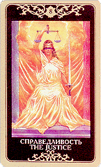 Справедливость (Правосудие) символизирует развитие, поиск свободы и независимости, объективность, тяготение к порядку. Бумаги, договоры, правовая деятельность. Карта означает, что при каждом действии вы должны предвидеть противодействие, чтобы смягчить или избежать столкновения. Перевернутая карта: будут преподаны неприятные уроки, смирение с неизбежностью. Судебная тяжба, развод, озлобленность, обидчивость. |