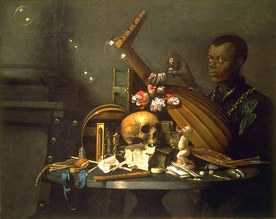 Давид Байлли (1584 - 1657), художник, работавший в Лейдене, где родился Рембрандт, как и все мастера голландской школы, был мастером натюрморта. Картина, которая здесь представлена, - необычно большой и великолепный пример этого жанра. "Vanitas", с латыни, означает суетность и преходящесть всего мирского, как, например, богатства, красоты, развлечений, образования и искусства. Изображение черепа в центре напоминает нам о тщете всего: музыки (лютня и флейта), изобразительного искусства (палитра, кисти, статуэтка), удовольствий (кости, карты, трубка, табак), учебы (книги), красоты природы (цветы). Песочные часы, солнечные часы и оплывшая свеча символизируют уходящее время, улетающие пузыри выражают недолговечность жизни; едва разборчивое письмо под черепом означает смерть и войну; и чернокожий слуга, элегантно одетый и с золотой цепью вокруг шеи (знак покорности) - еще один символ богатства, которое неизбежно проходит. Слуга держит миниатюрный портрет (неизвестного) хозяина , который заказал картину; и то , что он так мал, должно демонстрировать отсутсвие тщеславия и самодовольства.