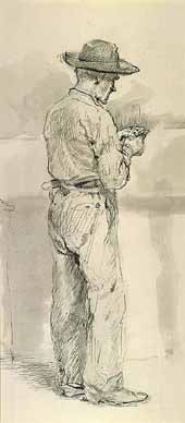 в характерной реалистичной манере, со стремительным, экспрессивным и верным рисунком, мастерством линии и контраста.