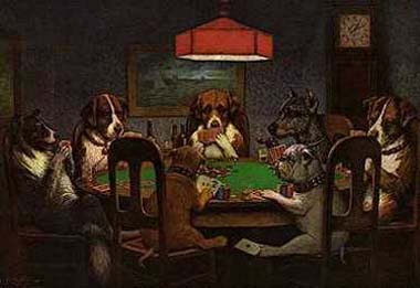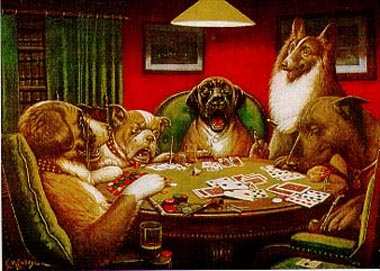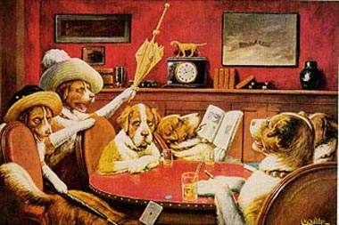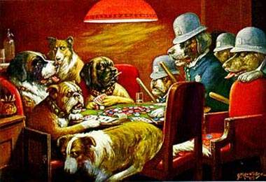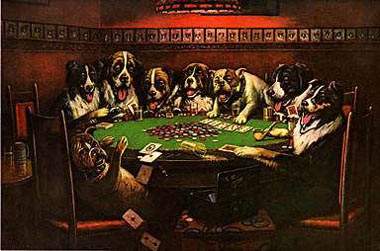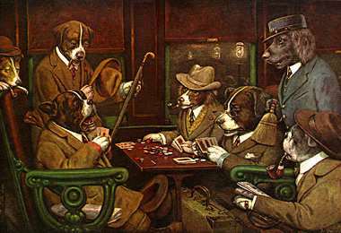 "Незадача с четырьмя тузами". Полицейская облава как раз в тот момент, когда у одного из псов "покер". |